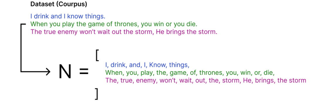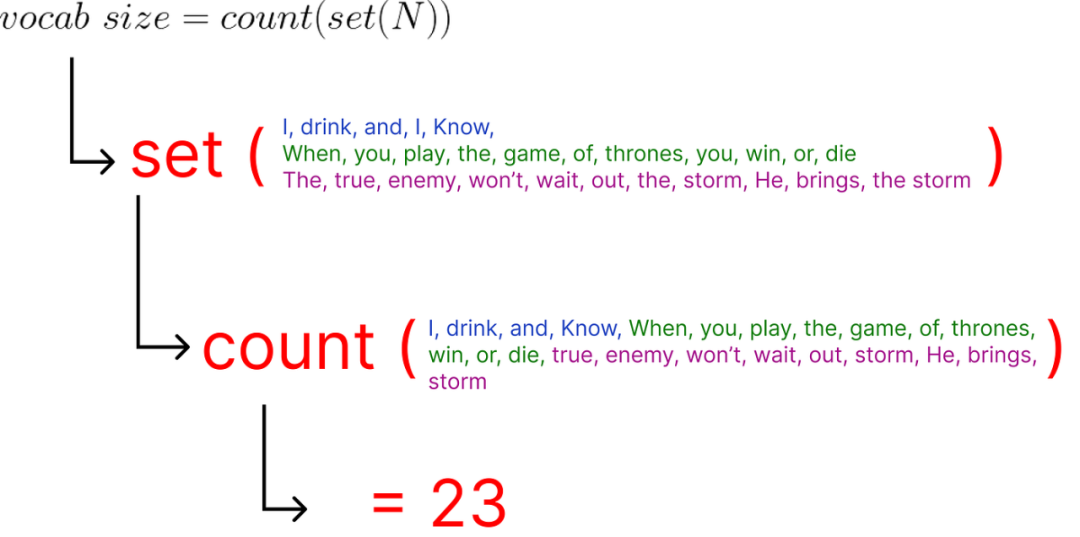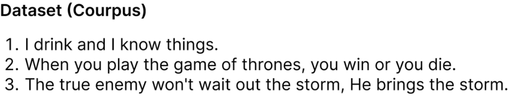 在我们的数据集中,有3个句子 (对话) 取自《权力的游戏》电视剧。尽管这个数据集看起来很小,但它已经足以帮助我们理解之后的数学公式。Step 2 (Finding the Vocab Size)