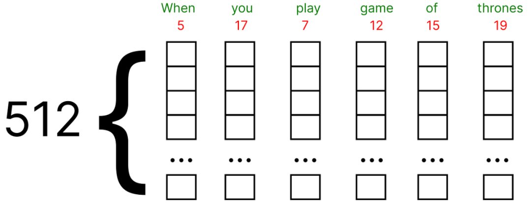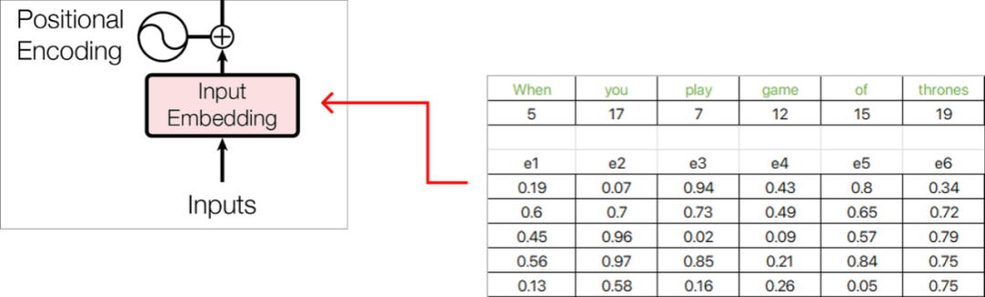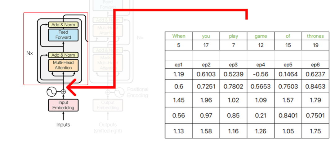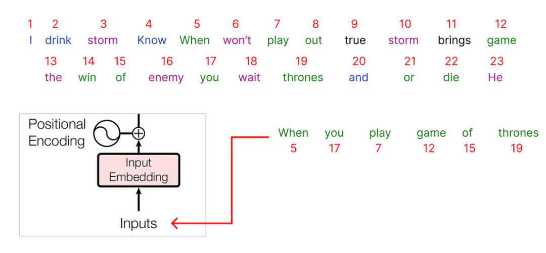 接下来为数据集的每个唯一单词分配一个整数作为编号。在对我们的整个数据集进行编码之后,是时候选择我们的输入了。我们将从语料库中选择一个句子以开始:“When you play game of thrones”作为输入传递的每个字将被表示为一个编码,并且每个对应的整数值将有一个关联的embedding联系到它。现在,每个单词embedding都由5维的embedding向量表示,并使用Excel函数RAND() 用随机数填充值。Step 4 (Positional Embedding)