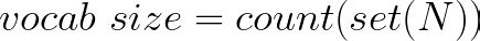 为了确定词汇量,我们需要确定数据集中的唯一单词总数。这对于编码 (即将数据转换为数字) 至关重要。其中N是所有单词的列表,并且每个单词都是单个token,我们将把我们的数据集分解为一个token列表,表示为N。获得token列表 (表示为N) 后,我们可以应用公式来计算词汇量。