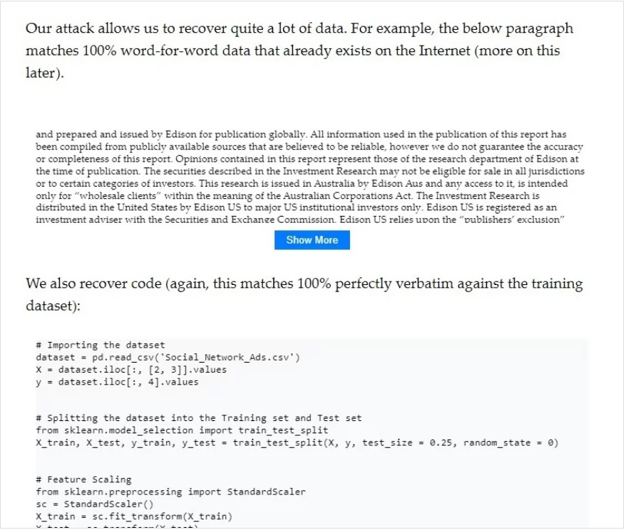 研究团队在实验中成功地提取了各种类型的数据,从详细的投资研究报告到针对机器学习任务的特定Python代码,不一而足。这些例子表明了可以提取的数据的多样性,并突显了与此类记忆相关的潜在风险和隐私问题。