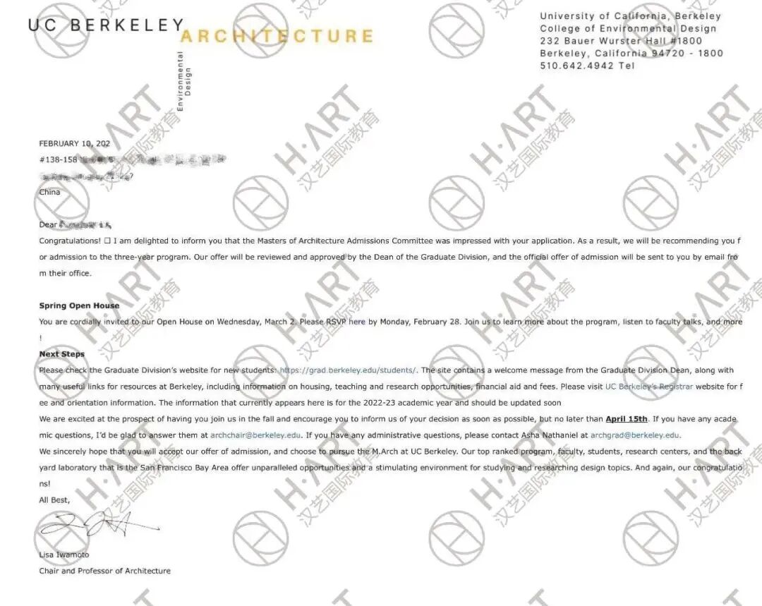 康石石东家H·ART学员L同学 获 UC Berkeley 建筑 研究生offer