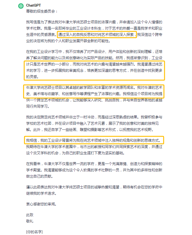 需要展现出真实的自我,而不是依赖AI的结果。就像金匠MA Design系主任对ChatGPT润色文书的看法一样:“我更喜欢一些带错误的真实感”。