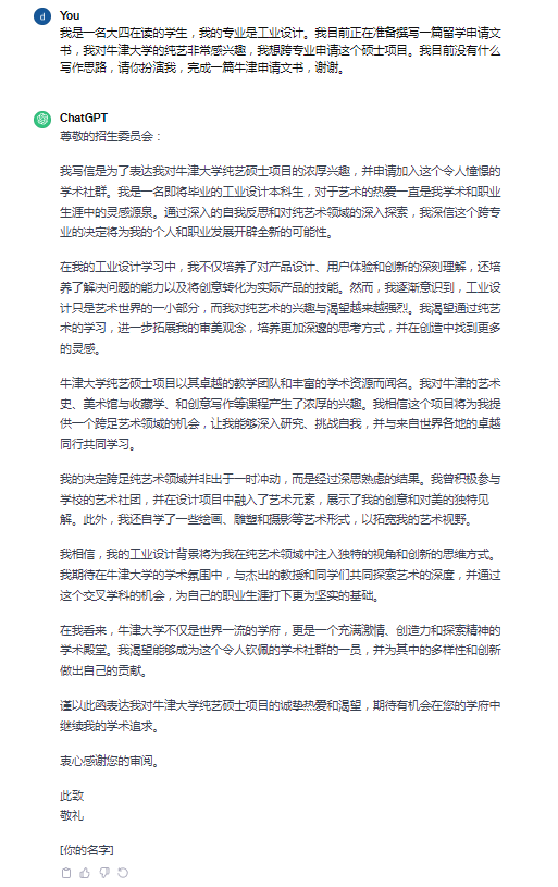 如果用ChatGPT写一段文书,结果会怎样呢?能不能达到申请学校的标准呢?