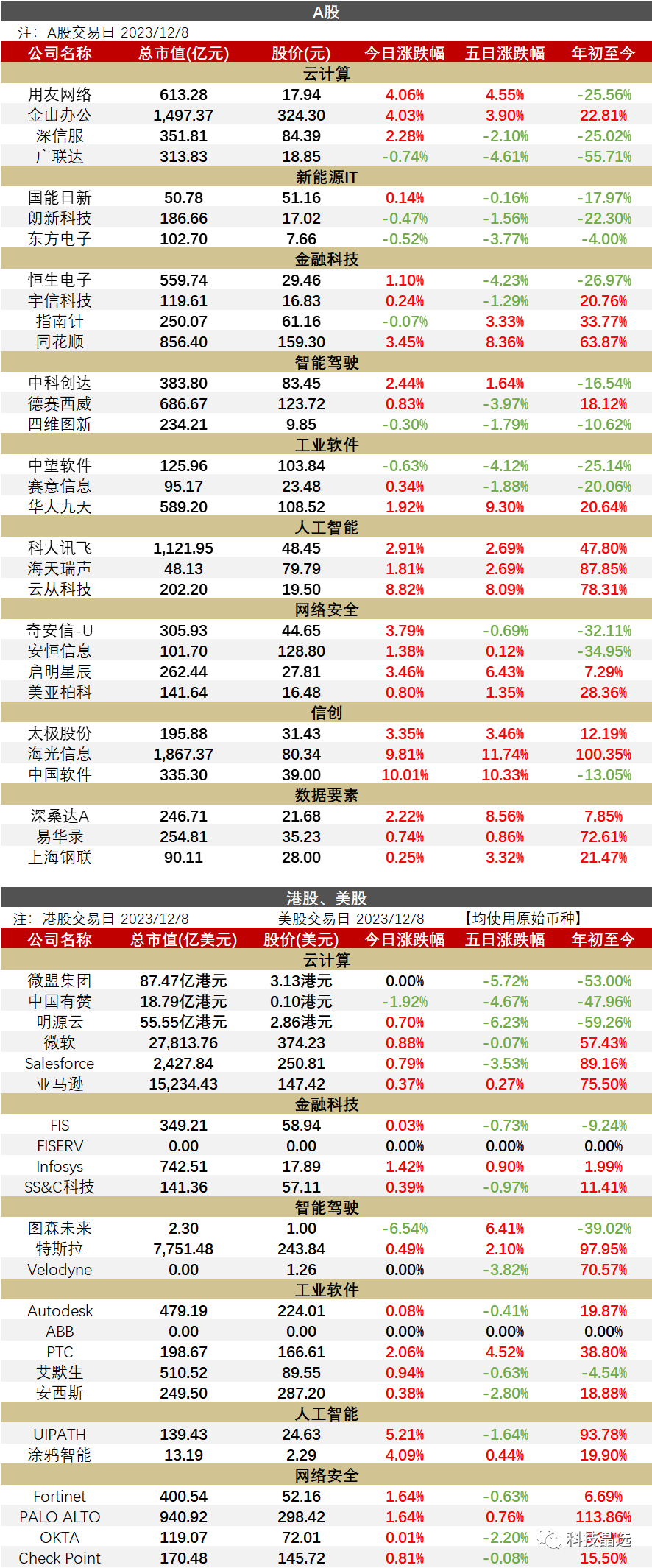 ► 凌志软件:关于以集中竞价交易方式回购股份达到公司总股本2%暨回购股份的进展公告截至2023年12月7日,苏州工业园区凌志软件股份有限公司(以下简称“公司”)通过上海证券交易所交易系统以集中竞价交易方式累计回购公司股份 8,178,588 股,占公司总股本400,010,003股的比例为2.0446%,回购成交的最高价格为15.80元/股,最低价格为 11.93 元/股,支付的资金总额为人民币107,184,721.88 元(不含印花税、交易佣金等交易费用)。► 中科星图:股东询价转让结果报告书暨持股 5%以上股东减持股份比例超过 1%的提示性公告股东宁波星图群英创业投资合伙企业(有限合伙)(以下简称“星图群英”)和宁波星图荟萃创业投资合伙企业(有限合伙)(以下简称“星图荟萃”)参与本次询价转让。星图群英和星图荟萃均系中科星图股份有限公司(以下简称“中科星图”或“公司”)员工持股平台,且中科星图部分董事、监事、高级管理人员及核心技术人员通过其间接持有中科星图股份。星图群英、星图荟萃非中科星图的控股股东、实际控制人。中科星图不存在《上海证券交易所科创板股票上市规则》第八章第二节规定的应当披露的经营风险及其他应披露而未披露的重大事项。中科星图副董事长、总经理邵宗有先生未参与本次询价转让。本次询价转让的价格为43.60元/股,转让的股票数量为15,785,756股。公司总股本由365,438,526股调整为 366,444,477股。本次询价转让后,星图群英持股比例由 17.98%减少至 15.40%,权益变动比例超过1%。