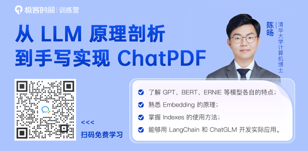 网上各种 AI 的资料、文档、教程,还有付费星球、社群...眼花缭乱,未免有“割韭菜”的嫌疑。在我看来,资料再多,不如一个高质量信息源头 + 跟着靠谱的实践先行者,在这分享一份极客时间官方整理的【AIGC 知识库】+陈旸博士的【从 LLM 原理剖析到手写实现 ChatPDF】课程。