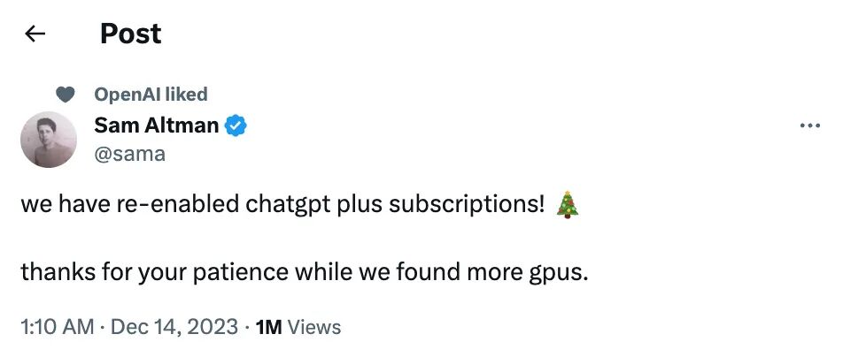 在暂停近一个月后,OpenAI CEO Sam Altman 今日宣布,目前已重新开放 ChatGPT Plus 订阅。据此前报道,11 月 15 日,由于需求巨大,OpenAI 决定暂停 ChatGPT Plus 付费订阅服务的新用户注册,以确保现有用户拥有高质量的体验。当时,Sam Altman 表示,该公司正在努力增加其容量,并希望很快恢复新用户注册。与此同时,他鼓励有兴趣的用户加入等候名单。
