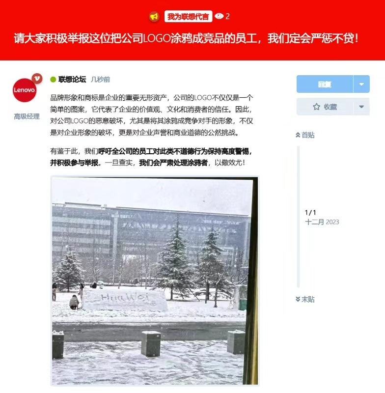 昨日,联想集团总部门口公司标识被人涂鸦成了「Huawei」。随后联想内部论坛等级为「高级经理」的账号发帖,声称「请大家积极举报这位把公司 LOGO 涂鸦成竞品的员工,我们定会严惩不贷」。昨日晚间,联想集团中国区市场部回应:「期盼已久的一场大雪,员工搞笑了一把,图个乐儿」。同时,联想产品总监 @林林-一枝小白兔 表示:原来是几个员工小朋友午休时间冲到园区打雪仗时的涂鸦「恶作剧」,结果别的员工小伙伴看到了以为发生了啥,就发在了内部的员工论坛上。 论坛是匿名的,且仅对内开放,论坛上所有的等级其实都是论坛上灌水的等级,比如在论坛上灌水少,所以只是个「主管」的等级,这个和实际职位完全无关。 而发这个帖子的同事是灌水灌到了比「主管」等级还高两级的「高级经理」。所以发了那些,实际上完全是 TA 个人的观点。他还称联想内部的气氛非常包容,内部讨论和开会也是非常包容的风格,所以有人担心对员工会有啥惩罚,「放心,我厂不是那种风格」。