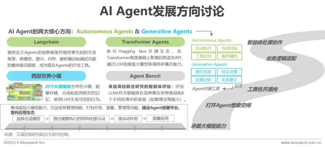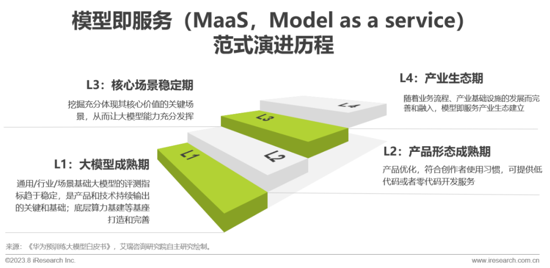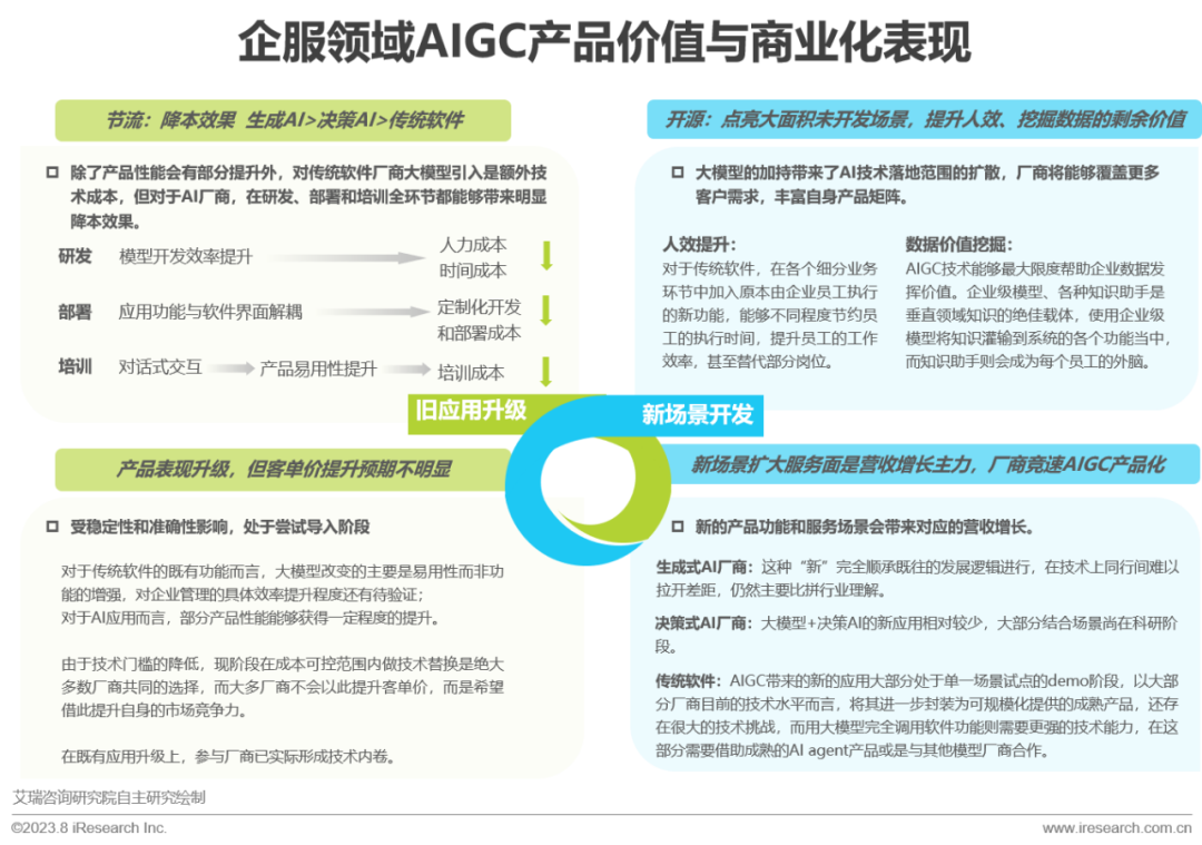 大模型的落地将提速AI工业化生产,并充分释放AI产业潜在市场空间大模型类似于一个能力全面且突出的“完全体”,不仅通用性强,且能力相比小模型有较大提升。因此,用大模型做应用开发,可以采用“预训练+微调”开发范式,只需要针对具体任务,对大模型进行二次开发、微调甚至只是单纯以领域知识库做辅助,就可以快速赋能应用。相比独立分散的小模型开发,标准化、流程化程度更高,在开发效率和运维成本上都有较大改善,有效促进了AI的工业化生产。同时,模型能力的提升使得更多AI服务可以落地,有效扩展了AI的应用范围,这些共同促进AI供需两侧潜力释放。打造大模型商店,为下游提供低门槛、低成本的模型使用与开发支持MaaS(Model-as-a-Service),模型即服务,是指以云计算为基础,将大模型作为一项服务提供给用户使用的新业态。如今,MaaS模式已成为各家云巨头厂商发展第一战略优先级,把模型作为重要的生产元素,依托于既有IaaS设施与PaaS平台架构,为下游客户提供以大模型为核心的数据处理、特征工程、模型训练、模型调优、推理部署等服务。未来,顺应大模型开源趋势,MaaS服务商将着力打造大模型商店平台,发力大模型生态建设,纳入更多允许商用的开源模型,提升平台的基模类型及能力,并丰富工具链产品服务,通过业务积累、数据回流、模型迭代逐步形成壁垒,在拉高云服务营收天花板的同时进一步塑造厂商的核心竞争力。模型即服务(MaaS)构建新型AI基础设施,重构AI开发部署范式随着企业上云进程中智能化转型需求的逐步增多和传统行业领域数据的不断积累,AI应用开发过程中逐渐面临大量细分领域的深耕、非典型客户需求,对算法的通用性和延展性提出了较高要求。传统“小模型”范式的AI应用开发流程一般针对单一场景,独立完成模型选择-数据处理-模型优化-模型迭代等一系列开发环节。因此,AI应用在定制化需求、长尾需求下的开发效率较低,且模型精度、性能、可扩展性等指标质量也会受到影响。随着AI产业深入及智能化需求增加,AI在研发门槛及开发效率的问题日益凸显。“预训练大模型”应运而生,其将数据中蕴含的知识通过无监督或者自监督学习方式提取出来,存储在具有大量参数的神经网络模型中。AI应用开发流程转变为,调用通用流程-结合行业经验-解决实际问题。未来,大模型将成为AI产业的操作系统,其基础设施特性可为AI应用开发做好底座,将AI模型变得可维护、可扩展、可迭代,极大降低AI应用的开发门槛。从需求侧来看,客户能通过更低成本、高效率的MaaS(Model As a Service)路径获得AI能力,完成AIGC应用的个性化开发、优化及部署,持续兑现大模型的技术红利,将AI能力应用渗透到各行各业的场景业务中。艾瑞提出EPS-EPD评估体系,定位大模型产品的基模性能与商业能力大模型能力评测意义重大,评测结果可让供需两侧了解各家大模型能力的优势与不足,做出更好的产品调优与应用选择。随着大模型产业的发展迭代,评测基准体系也在不断完善。艾瑞判断,未来大模型的产品服务能力评测将作为一项工具包,打包在大模型平台中为客户提供产品服务。对此,艾瑞提出EPS-EPD评估体系,以其为核心构建一系列评测集,对市面公开大模型能力展开测评,全维度定位大模型产品的基模性能与商业能力,为业内各界对模型评估有结果需求的客户提供信息参考。基础大模型落地面临两大难题,一是终端客户对算力成本的接受能力,二是大模型虽擅长通用领域问题,但往往在垂直行业任务中表现欠佳。因此,基础大模型会通过领域数据或专属知识库进行训练和调优,形成垂直领域的行业大模型或业务大模型;此外,部分企业还具有深度定制、私有化部署的需求,需要在行业大模型基础上,进一步加入企业专有数据进行训练或微调,形成企业级大模型。从商业化布局角度来看,如今基础大模型厂商可分为三类参与者,分别为云巨头厂商、人工智能公司、学术研究机构及创业公司,在定位有通用能力基座的同时打通向上商业化路径。其中,云巨头厂商将借助云服务及数据库资源,更强调MaaS能力输出。AI公司或创业公司将借助业务积累或生态资源锚定几个典型行业或业务场景展开商业占领。从开闭源角度来看,基模厂商普遍采用前文所述的“轻量级开源、千亿级闭源”的发展路径,而向上分化的垂直领域厂商将基于开源模型或基模平台开发部署细分领域模型产品,厂商优势在垂类数据与业务理解。若客户,如金融行业,对模型的开源性及私有化部署有明确要求,则开源路径会是该类需求的典型落地形态。数据准备、ROI衡量、 Prompt工程是连接模型层与应用层的落地三要素在本轮大模型推动的技术浪潮下,如何连接模型能力与上层应用,完成商业化变现,构建人工智能应用主导的生态系统是AIGC各层厂商重点关注的课题。艾瑞认为,数据准备,ROI衡量与Prompt工程能力是连接模型层与应用层落地的核心三要素。由于AI研究进展缓于国外、中文数据集论文发表难度高、NLP算法改进验证与数据集语言类型关联度低等历史性原因,目前中文NLP数据集语料库在数量与质量方面仍有较大差距。从可行性、性价比与时间角度出发,追赶期间同步发展典型行业应用数据集是弥补中文NLP数据集短板的有效策略;从需求侧角度出发,大模型能力应用化需结合业务场景与成本效益选择大模型