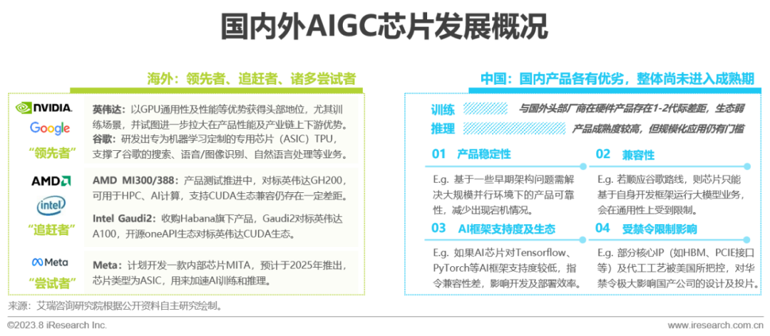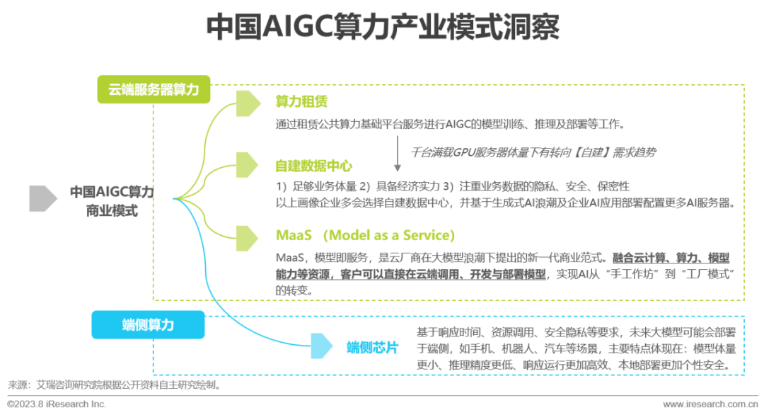 智能算力资源或将更多承载于云服务产品,以MaaS模式服务千行百业过去数据中心以租赁与自建为主,算力需求方基于自身业务量级、财务预算情况、数据隐私要求等情况进行选择租赁或自建。在AIGC时代背景下,数据中心将配置更多AI服务器满足日益剧增的智能算力需求,云厂商更是提出MaaS(Model as a Service)模型即服务的商业模式,将云计算、智能算力、模型能力等资源做高度融合,客户可以直接在云端调用、开发与部署模型,更好适配于客户的个性化需求。未来,更多长尾企业的需求体量将拥抱MaaS商业模式。相较于云端算力发展,端侧大模型虽然发展较缓,仍是各家终端厂商发展的技术焦点,如从苹果招聘信息中可观测到其对“在端侧实现推理和加速大语言模型功能“的人才需求及产品规划。未来,随着大模型轻量级开源版本的发布,大模型有望进行进一步剪裁优化,将推理能力部署在端侧,并带动手机、机器人等端侧芯片发展。大模型时代下,数据中心将进一步优化网络带宽、能源消耗与散热运维等预训练大模型的训练推理需要巨量数据资源与高性能计算机的全天候高速运转,对数据中心的网络带宽、能源消耗与散热运维等能力提出更高要求。首先,网络是数据中心最为重要的组成部分,随着数据量与计算量的飞涨,数据中心需优化网络带宽,实现数据在节点内与节点间的高吞吐低延迟的传输与连接,并进一步优化计算集群的架构与设计,保证数据中心的高效利用率;其次,能源消耗与碳排放问题是数据中心亟需关注的重点问题。普通服务器的标准功耗一般在750~1200W,而AI模型运行时会产生更多的能耗,以CPU+AI芯片(搭载4卡/8卡)异构服务器为例,系统功耗一般会达到1600W~6500W。根据斯坦福大学发布的《2023年AI指数报告》数据显示,GPT-3模型训练耗费的电力可供一个美国家庭使用数百年,CO₂排放量也相当于一个家庭排放近百年;另一方面,基于大模型算力需求的高能耗运行,其热量释放呈现倍增态势。为了确保服务器能够长期处于适合的工作温度,数据中心将更注重系统设计和散热技术的发展应用。大模型散热需求加速由风冷到液冷的技术升级,进一步提升经济性、节能效果和散热效率等。散热也将更贴近发热源,由机柜级散热、服务器级到芯片级发展。目前,中国大力推进“东数西算” 工程,并发布《新型数据中心发展三年行动计划(2021-2023年)》等政策性文件,引导新型数据中心实现集约化、高密化、智能化建设,在AIGC时代下完成中国算力产业在规模、网络带宽、算力利用率、绿色能源使用率等方面的全方位提升。为服务于大模型的训推,AI芯片需进一步升级内存、带宽、互联等能力算力是评价AI芯片的核心要素,而除了运算次数外,芯片的性能衡量还需考虑运算精度。基于运算数据精度不同,算力可分为双精度算力(FP64)、单精度算力(FP32)、半精度算力(FP16)及整型算力(INT8、INT4)。数字位数越高,代表运算精度越高,可支持的运算复杂程度越高,以此适配更广泛的AI应用场景。为了适配大模型的训练及推理,AI芯片要求有更大的内存访问带宽并减少内存访问延迟,由此带动由GDDR到HBM的技术升级,另一方面需要更高的片间互联甚至片内互联能力以满足AI加速器访存、交换数据的需求。最后,大集群不等于大算力,在大规模集群部署下,集群训练会引入额外通信成本,节点数越多算力利用率越低,且单点故障影响全局运行。因此,同比增加GPU卡数或计算节点,不能线性提升算力收益,中国面临的单卡芯片性能差距将更难通过堆料等方式解决。英伟达能否延续强者恒强?中国何时迎来自主创新芯片曙光?作为AIGC产业的基建层,算力是AIGC生产力卡脖子的关键环节。对此,算力生产商纷纷发力,如AMD、英特尔等追赶型企业针对AIGC的产品新品动作频频。对标英伟达的Grace Hopper,AMD推出“CPU+GPU”双架构的Instinct MI 300进军AI训练端。英特尔即将在2025年发布Falcon Shores GPU,将其混合架构改为纯GPU解决方案。目前,国内大模型训练芯片仍以英伟达GPU为主,且英伟达作为首批训推部署框架成品及平台生态将进一步巩固其在生成式AI的优势地位,但国内客户正积极与海内外追赶型企业如AMD接触,意图打破英伟达的溢价与垄断体系。自2018年以来,美国陆续对中国企业实行贸易管制,进入到美方黑名单上的中国企业已达到了千余家,尤其在半导体、人工智能等先进科技领域,国产芯片实现自主创新迫在眉睫,中国科技部也陆续出台政策推动人工智能公共算力平台建设。目前国产芯片虽在成片进度有所突破,但整体还尚未进入成熟期。以适配AIGC大模型训练角度出发,国产产品会出现宕机、兼容性差、AI框架支持度低及核心IP受限等过渡性问题。在AIGC浪潮下,AI芯片发展路径更加聚焦于AISC品类,中国算力层也会进一步尝试脱离对头部厂商英伟达的依赖,以“云巨头自研自用+独立/创业公司服务于信创、运营商等To G与To B市场”为两条主线发展路径,静待国产替代曙光,实现国产“算力+应用”的正循环。