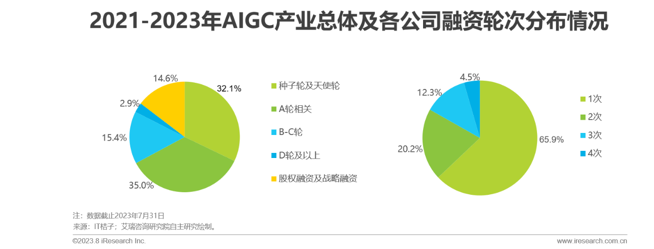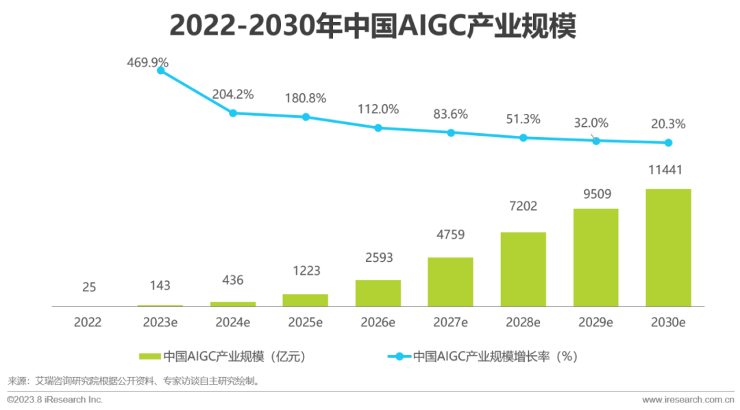 市场规模呈指数级增长,突破规模化临界点攫取万亿产业价值根据第50次《中国互联网络发展状况统计报告》,截至2022年6月,中国互联网普及率已高达74.4%。在网民规模持续提升、网络接入环境日益多元、企业数字化进程不断加速的宏观环境下,AIGC技术作为新型内容生产方式,有望渗透人类生产生活,为千行百业带来颠覆变革,开辟人类生产交互新纪元。艾瑞咨询预测,2023年中国AIGC产业规模约为143亿元,随后进入大模型生态培育期,持续打造与完善底层算力基建、大模型商店平台等新型基础设施,以此孕育成熟技术与产品形态的对外输出。2028年,中国AIGC产业规模预计将达到7202亿元,中国AIGC产业生态日益稳固,完成重点领域、关键场景的技术价值兑现,逐步建立完善模型即服务产业生态,2030年中国AIGC产业规模有望突破万亿元,达到11441亿元。模型创业初抬头,多模态、跨模态备受青睐,资本扎堆优质项目2021年至2023年7月期间AIGC赛道共发生280笔投融资,展现了其高热度与高成长性。从产业细分维度,应用层创业机会最多,模型层创业受到ChatGPT影响,在2023年集中涌现;在获投的应用与模型层创业项目中,文本、影像、语音平分秋色,但相比单一模态,多模态和跨模态的应用前景更加为资本所看好。从投融资轮次维度,70%左右的项目仍处于A轮及以前阶段,同时有高达14.6%的比例属于股权、战略融资,说明赛道虽然处于起步期,但其战略价值已被公认。在全部获投的170家公司中,获投3次及以上公司约占17%。同一标的的高频融资,从企业需求侧反映AIGC前期创业所需大量资金支持,从资方供给侧表明优质创业项目仍非常稀缺。