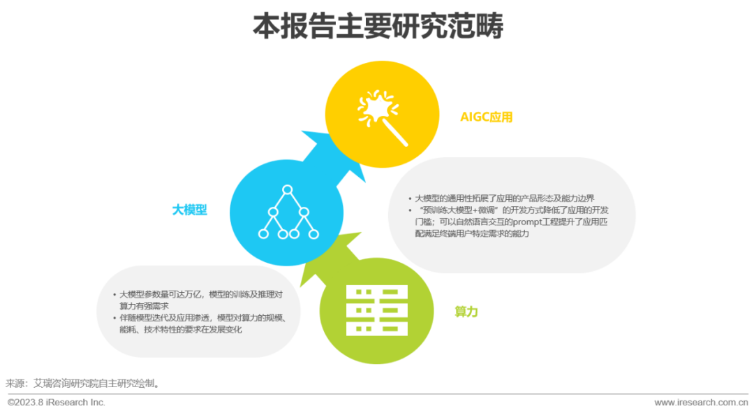 AIGC(AI-Generated Content)指利用人工智能技术(生成式AI路径)来生成内容的新型内容生产方式。2022年11月上线的AIGC应用ChatGPT,凭借其在语义理解、文本创作、代码编写、逻辑推理、知识问答等领域的卓越表现,以及自然语言对话的低门槛交互方式,迅速获得大量用户,于23年1月突破1亿月活,打破前消费级应用的增速记录。微软称其在GPT-4(ChatGPT Plus背后运行的大模型)中看到了AGI(通用人工智能)的雏形。大众的生活工作日常出现了Midjourney等新形态的各类AIGC应用,各行业的智能化升级也看到了新的可能性,“AI产业”与“产业AI”的想象空间进一步拓展。AIGC应用创新的技术支撑为“生成对抗网络(GAN)/扩散模型(Diffusion)”与“Transformer预训练大模型”的两类大模型分支。在国外AIGC应用展示出大模型的能量的同时,我国企业也加强了相关产品技术布局,云厂商、AI大厂、创企、各行业公司及技术服务商等产业各领域玩家纷纷发布大模型或基于大模型的应用产品及各类技术服务。相较于一般AI应用,大模型应用的训练及推理需要更强的算力支持。综上,本报告将围绕模型、应用、算力三个角度对AIGC产业的发展进行探讨,试图在讨论开源闭源、垂直通用、知识幻觉等大模型未来发展的各种不确定性的同时,为AIGC应用的迭代升级、产业的智能化应用,提供尽可能多的研究辅助,为那个不一定是AGI但一定更AI的未来提供确定性的加速度。