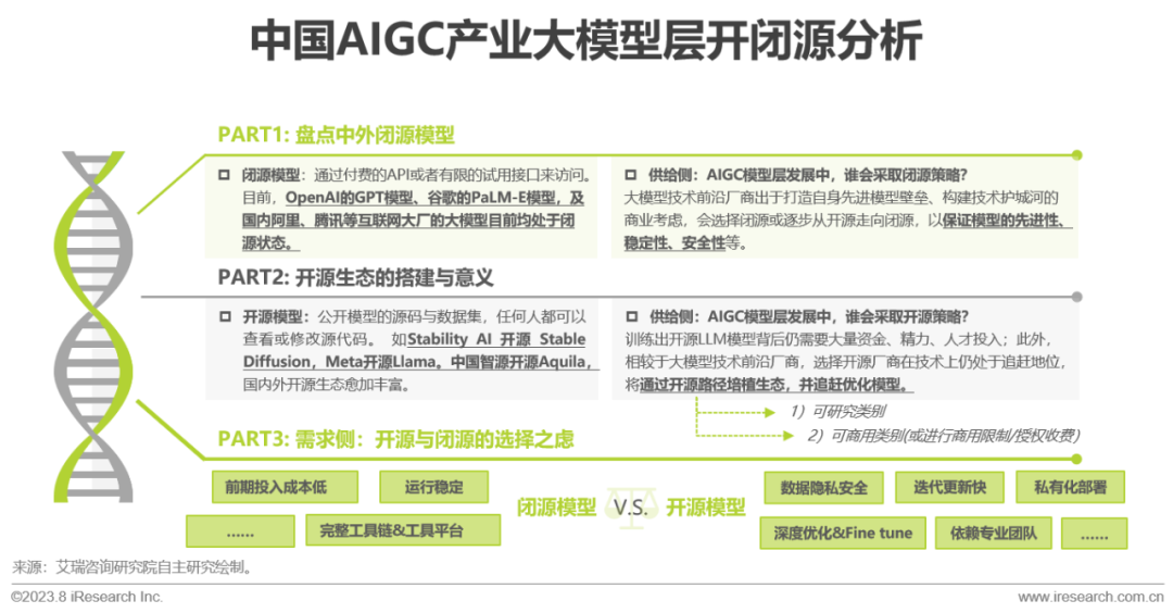 基于两大类基础架构衍生出各类大模型;多模态已成趋势预训练大模型按照模态可以分为文本、图像、视频、代码、音乐生成等多种,但从底层架构上都分属两类。Transformer是一种编解码模型框架,适用于处理文本、代码这类强连续性生成任务;Diffusion、GAN、NeRF等框架善于处理图像生成类任务。叠加文-图转换技术可以形成文生图模型。由单模态模型在实际训练时融合其他模态技术,可形成多模态、跨模态大模型,如GPT-4、文心一言、 Mid journey等,由于多模态模型可接受文本、图像等不同输入输出形式,对应用场景能够更广泛适配,着力发展多模态模型成为产研两界共同趋势。了解人工智能时代的“iOS”与“安卓”,闭源与开源市场将并存互补在以OpenAI为代表的闭源模型厂商开放对外技术服务后,开源模型厂商也在加紧发力,以Meta的Llama模型为代表陆续开源迭代,意图进一步实现生态层面的跑马圈地,2023年上半年LLM与数据集迎来开源季。大模型的开源可根据开源程度分为“可研究”与“可商用”级别。2023年2月,Meta发布了开源大模型LLM的第一个版本Llama,授予“可研究”用途。2023年7月进一步发布“可商用”的Llama2版本,虽然有日活超过7亿产品需额外申请、不能服务于其他模型调优等的商用限制,但海外很多中小企业已可用Llama2的模型来做私有化部署,基于Llama2开源模型训练出定制化的可控模型。由于Llama2基本不支持中文,对中国的大模型商用生态暂时不会产生实质性变化,中国仍需开发培育适配于中文数据土壤的开源生态。闭源LLM可为B端用户和C端消费者持续提供优质的模型开发及应用服务;开源LLM可从研究角度促进广大开发者和研究者的探索创新,从商用角度加速大模型的商业化进程与落地效果。未来,开源和闭源的LLM会并存和互补,为大模型发展共同创造出多元协作的繁荣生态。轻量级模型陆续开源,助力开源生态建设,千亿级模型暂以闭源路径开展AIGC开源社区的建设可以吸纳更多的开发者及拥有定义用户的主导权,以AI开源创新平台为杠杆,带动支撑底层AI芯片、智算中心及云服务等基础设施发展。从供给侧逻辑来看,大模型开源早期由高校和机构推动,如清华大学的ChatGLM-6B、复旦大学的MOSS,陆续有头部云厂商加入,如百度的文心系列与阿里的通义系列,共同为中国AIGC开源社区的建设“增砖添瓦”,以阿里云魔塔社区、百度云飞桨社区为代表的开源社区建设成果初现,而千亿级模型暂以闭源路径开展,凭借稳定、优质效、完整工具链等产品特点定位应用市场;从商业化路径来看,参考海外明星开源社区Hugging Face的商业模式,中国AI开源社区同样会先免费提供基础算力,为客户提供免费的社区体验、demo部署及测试,并进一步通过付费服务推送轻量级迁移的微调推理服务或深度开发的训练调优平台,提升模型产品性能,通过开源社区吸引开发者、企业客户完成更多部署应用资源的引流变现。