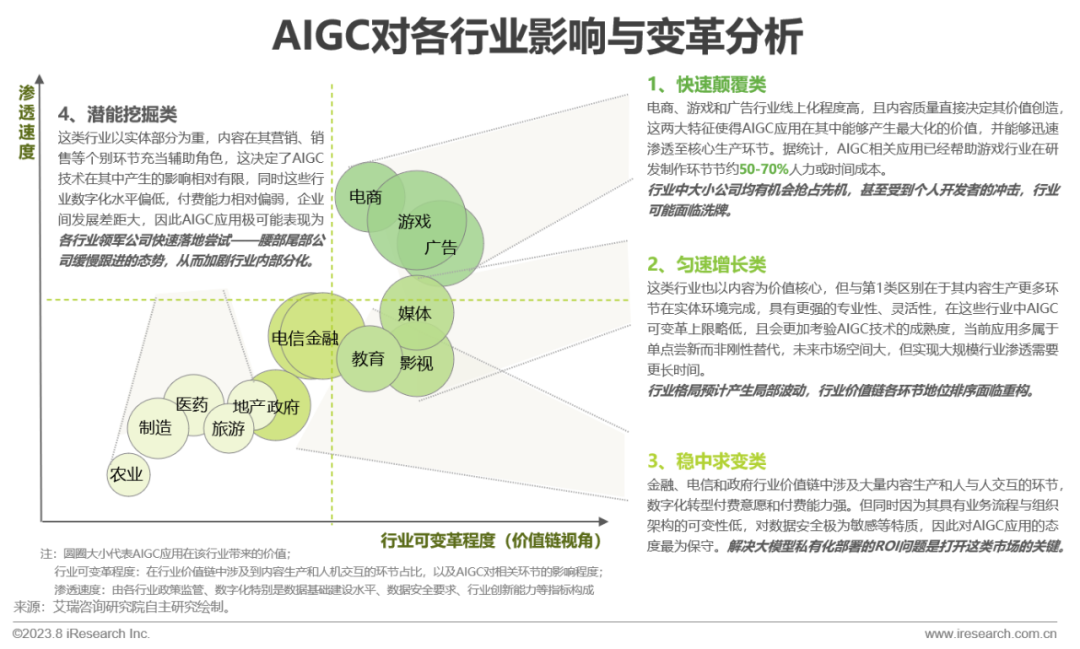 生活领域充分释放用户创新能力,生产领域全面革新交互体验和效率以大模型为标志,生成式AI是一次新的技术革命,同时还具有极强的普适性,能够对人类生产、生活的方方面面进行改造与升级。在生活领域,AIGC将通过进一步下放内容创作权,激发UGC创作热情,加速内容裂变。加之社区玩法在部分内容平台的良好盈利表现,内容消费领域从技术到商业模式的路径已全线打通,以社区形式,通过用户自发交流自主创作形成粘性,是各类平台的发力方向。在生产领域,大模型能从研发流程、产品能力和交互上全方位为企服软件带来提升,也充分开拓了新的服务场景,因此各类企业数字化厂商都将围绕大模型寻找自身优势空间与定位。线上化程度、数字化基础、行业内容占比等影响AIGC应用前景与渗透速度总体而言,AIGC主要影响内容创作与人机交互,因此价值链线上化程度越高,内容在价值链中占比越高,AIGC对其颠覆效应越明显;另一方面,行业自身的数据、知识、监管要求等特点也会深刻影响到AIGC技术的渗透速度。比如电商、游戏、广告、影视传媒等以内容生产为价值核心的行业,以及电商、金融等研发设计、营销等环节在行业价值链中地位较高的行业,能够快速看到AIGC应用对原有生产工具的替代和业务流程的变革。内容分发平台一端链接创作者,一端绑定大量用户,拥有最为完整的内容消费生态,也天然成为了AIGC内容消费的布局核心。原本,内容消费市场按照创作者和商业模式可大致分为PGC和UGC。PGC专业性强,以内容付费为主要盈利模式,需要快速大量推出新内容刺激用户购买,因此PGC平台的主要战略是前向打通内容制作环节,并为了提高用户粘性同步发展UGC;UGC内容相对生活化,本质是贩卖流量,需要将内容质量保持在可持续吸引用户注意力的水平。因此,两类平台均在积极布局面向UGC的AI创作工具。