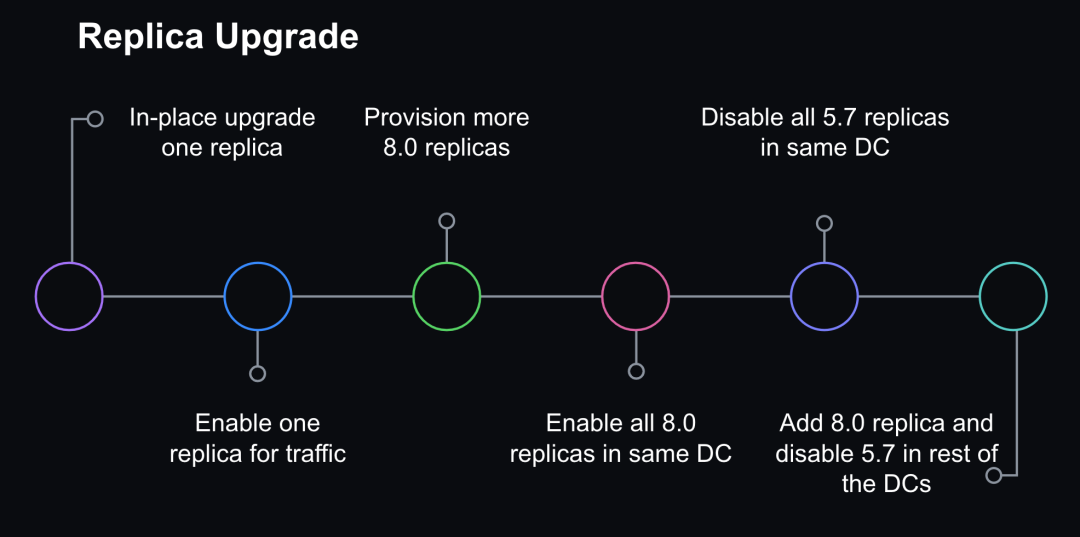 由于需要操作两个版本的 MySQL,因此 GitHub 内部使用的工具和自动化设施需要能够兼容处理混合版本,并了解 5.7 和 8.0 之间新的、不同的或已弃用的语法。为了满足可用性标准,GitHub 团队采取了逐步升级策略,满足在整个过程中进行 checkpoint 和回滚的需求。下面是他们制定的升级计划:至于为什么要升级到 MySQL 8.0,GitHub 团队表示主要是因为 MySQL 5.7 的生命周期即将结束。此外升级后可以获得最新安全补丁、错误修复和性能增强的 MySQL 版本。他们还希望测试 8.0 中的新功能并从中受益,包括即时 DDL、隐形索引和压缩的 bin 日志等。详细的技术细节查看:https://github.blog/2023-12-07-upgrading-github-com-to-mysql-8-0/