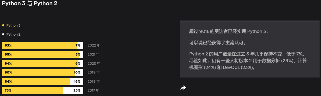 ,93% 的开发者使用 Python 3。相比下在 2021 年度的调查中,95% 的开发者使用 Python 3,5% 的开发者使用 Python 2。