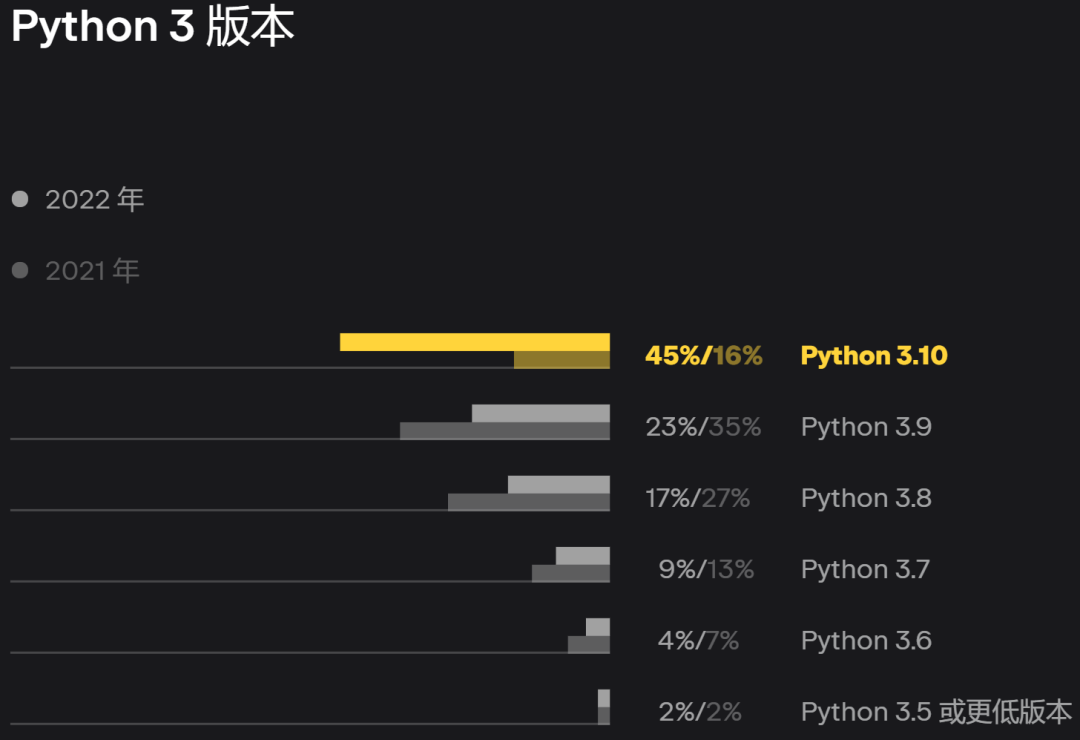 对于 Python 3 版本使用情况,Python 3 开发者中有 45% 使用两年前发布的 Python 3.10,2% 使用 Python 3.5 或更低版本。