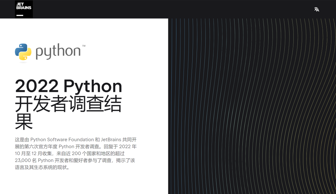 这是由 Python 软件基金会 (PSF) 和 JetBrains 共同开展的第六次官方年度 Python 开发者调查,回复于 2022 年 10 月至 12 月收集,来自近 200 个国家和地区的超过 23,000 名 Python 开发者和爱好者参与了调查,揭示了该语言及其生态系统的现状。