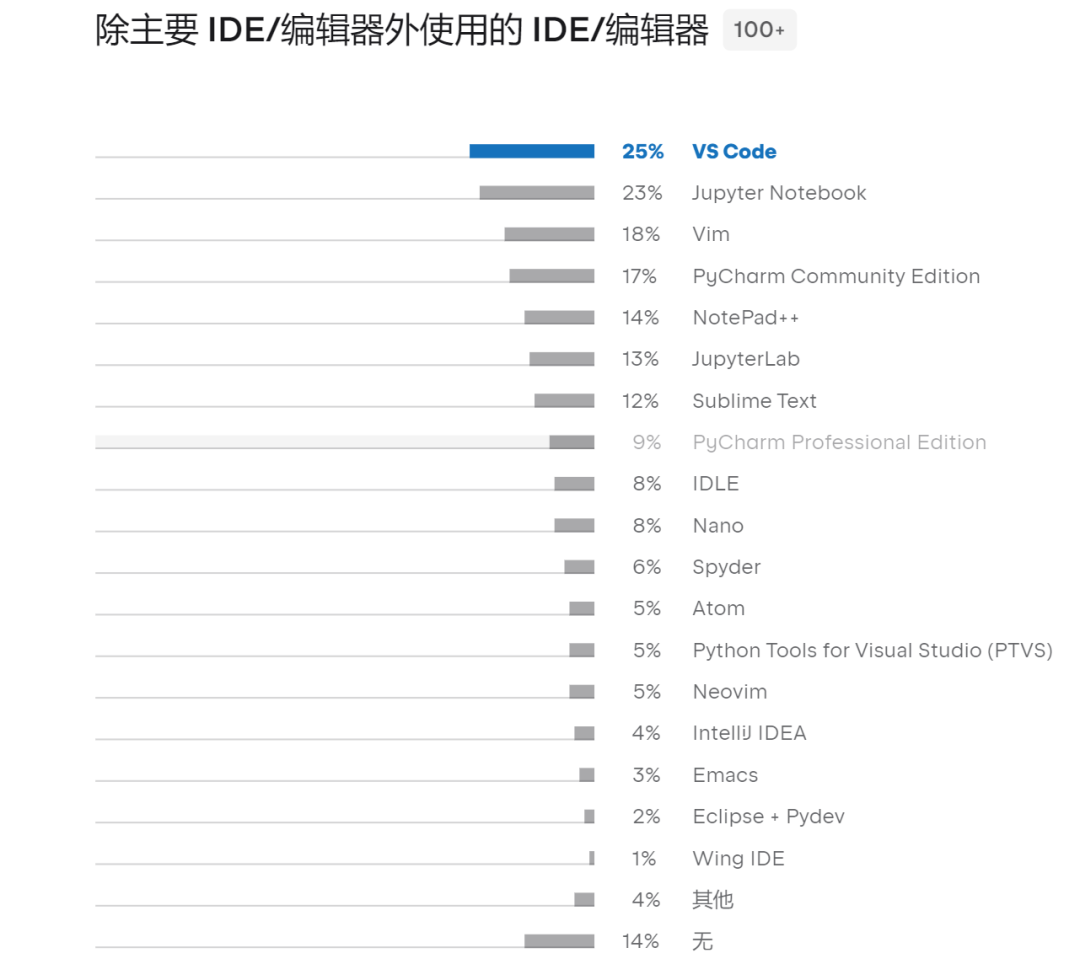 只有 14% 的受访者只使用一款 IDE 或编辑器,绝大多数 (61%) 同时使用 2-3 款 IDE 或编辑器。26% 的 Python 开发者更喜欢 PyCharm 作为额外 IDE,
