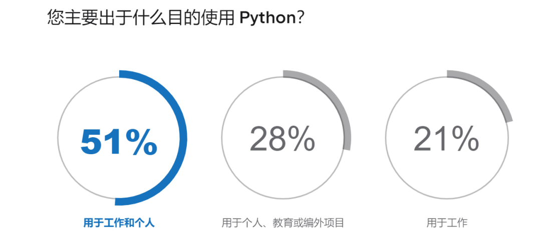 调查还发现,21% 的开发者表示只在工作中使用 Python,51% 将 Python 用于工作和个人 / 教育用途或业余项目。