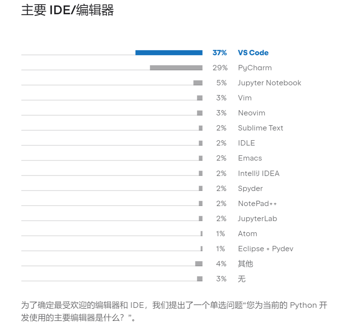 是 Python 开发的前两大 IDE,有三分之二的受访者选择。