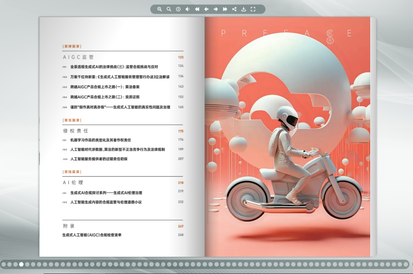 在这本文集中,我们将从AIGC的法律问题概览出发,探讨知识产权的挑战与合规,透视数据合规的问题与路径,研究AIGC的监管合规挑战与应对,理解侵权责任的新形态及法律规制,思考AI伦理的问题与治理,并在最后奉上一份详尽的AIGC应用的合规指引清单。