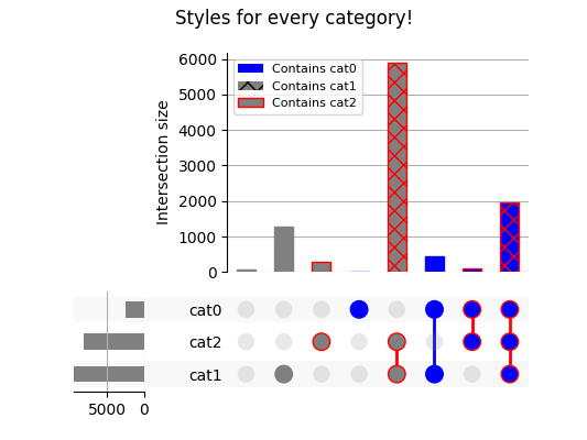upset = UpSet(example, facecolor="gray" ) upset.style_subsets(present="cat0" , label="Contains cat0" , facecolor="blue" ) upset.style_subsets(present="cat1" , label="Contains cat1" , hatch="xx" ) upset.style_subsets(present="cat2" , label="Contains cat2" , edgecolor="red" )# reduce legend size: params = {'legend.fontsize' : 8} with plt.rc_context(params): upset.plot() plt.suptitle("Styles for every category!" ) plt.show()