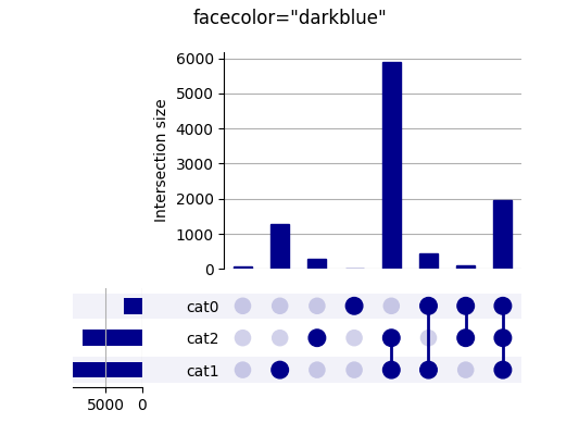 Hiding subsets based on size or degree from matplotlib import pyplot as plt from upsetplot import generate_counts, plot example = generate_counts() plot(example, facecolor="darkblue" ) plt.suptitle('facecolor="darkblue"' ) plt.show()