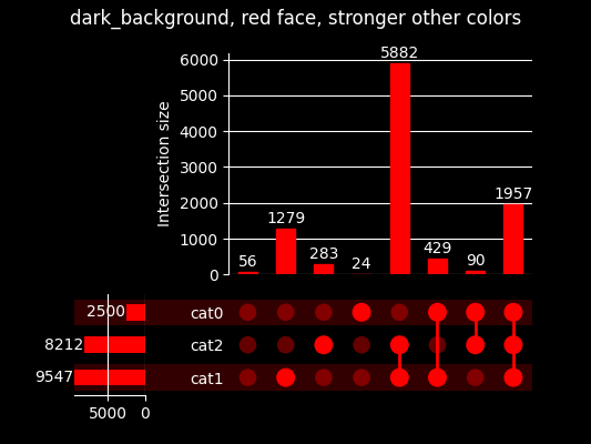 with plt.style.context('dark_background' ): plot(example, show_counts=True, facecolor="red" , other_dots_color=.4, shading_color=.2) plt.suptitle('dark_background, red face, stronger other colors' ) plt.show()