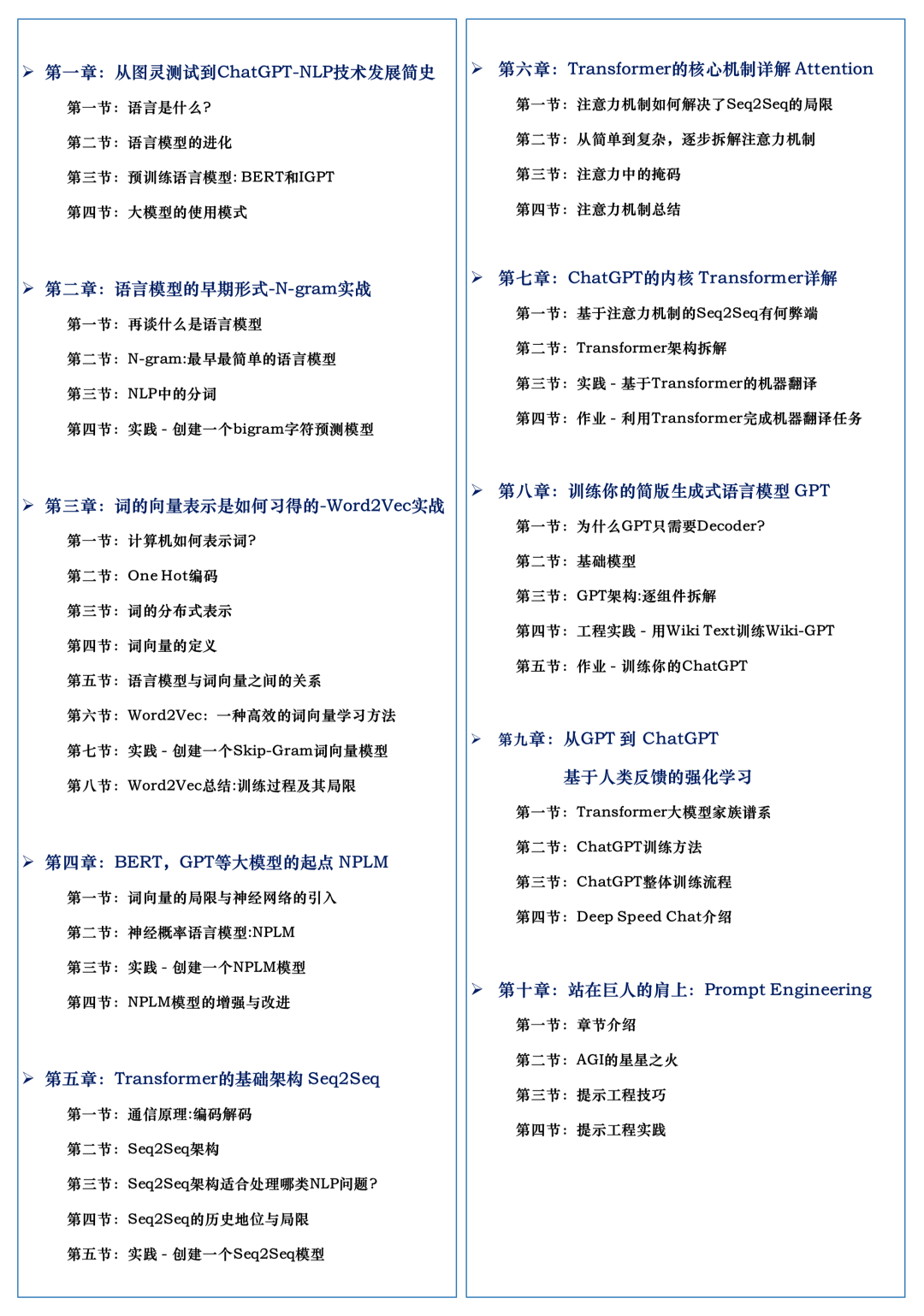 本门课程采透彻理解以ChatGPT为代表的生成式语言模型的原理以及代码实现,自主开发属于自己的ChatGPT。(1)掌握语言模型的经典与主流算法,及其发展脉络;1. 你将获得现代NLP技术的关键内核和完整脉络(摒弃一切已经不需要过多了解的过时东西)