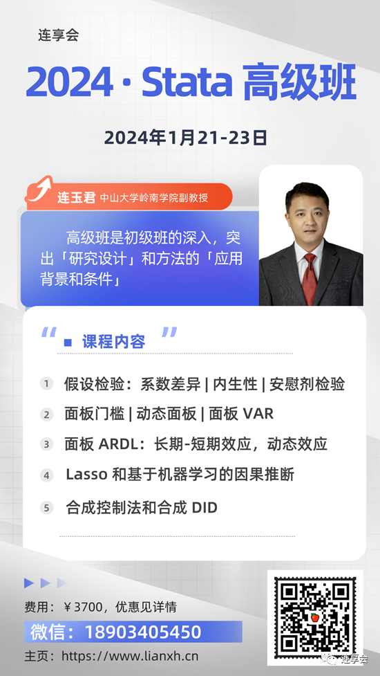 Stata 高级班 是初级班的深入,涵盖目前主流分析方法和研究设计框架。高级班采用「庖丁解牛」的方式讲解目前 Top 期刊中使用的计量方法和模型,突出「研究设计」和方法的「应用背景和条件」。