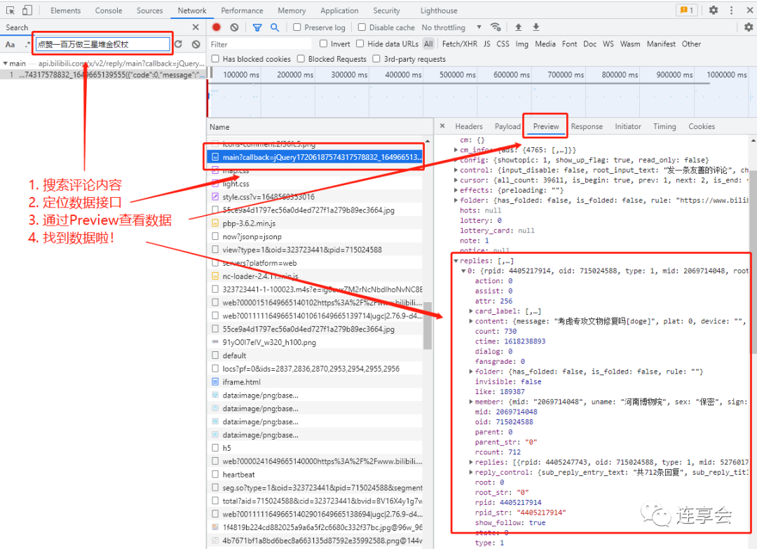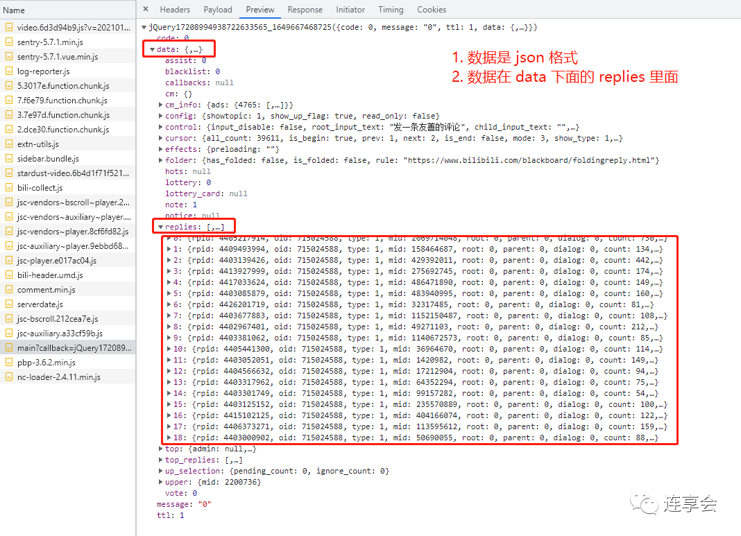 请求成功后,我们再来看请求回来的数据是什么样的,如何根据获取自己需要的数据。回到数据接口中,我们可以看到数据是通过 json 格式存储的,而每条评论的数据在 data 下面的 replies 中。