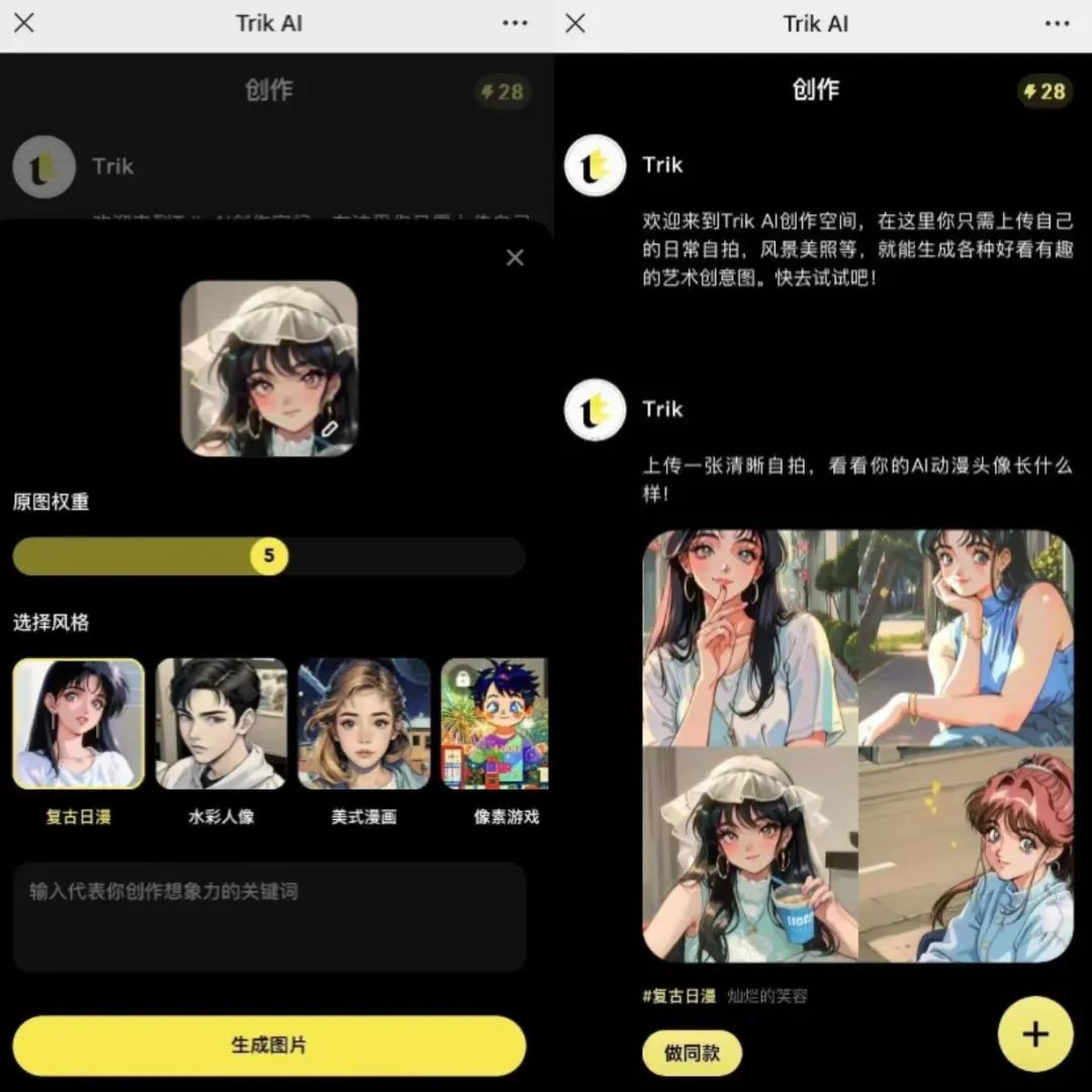 四月,小红书官方发布了一款名为Trik的AI绘图应用,用户上传日常照片后,Trik将用算法把照片转化成各类AI图片。