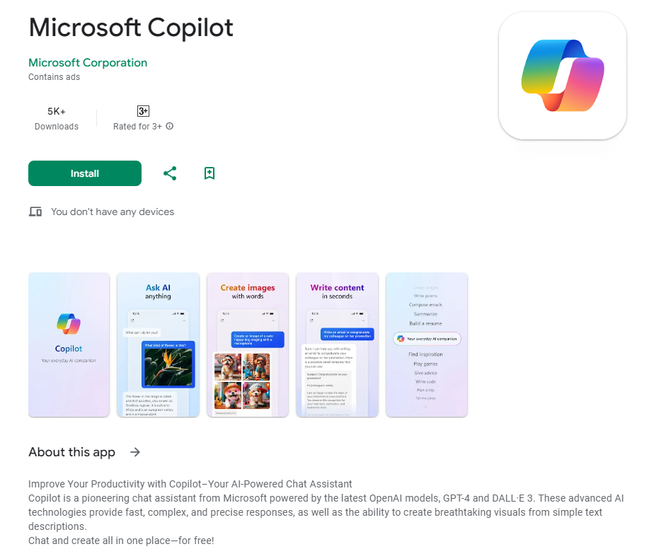 据外媒Neowin昨日报道,有网友发现,微软已于一周前悄然推出安卓版Copilot应用程序,用户可从Google Play商店下载。应用程序描述显示,Copilot由最新的OpenAI模型、GPT-4和DALL·E 3提供支持,这些先进的AI技术提供快速、复杂和精确的响应,并且免费。截至目前,微软暂未推出iOS版Copilot。