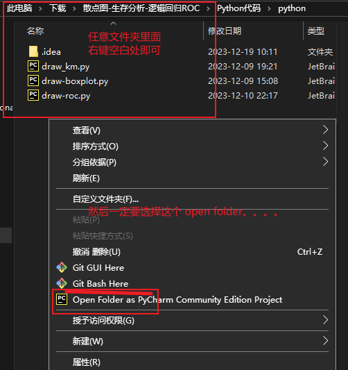 如何使用这个IDE呢在你Windows电脑的任意文件夹里面,如果已经有py代码文件,如下所示,在Windows电脑就可以通过鼠标右键选择**PyCharm:**就可以把文件夹打开成为一个工作环境,在MacOS电脑也是如此,就有点麻烦 :