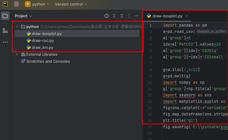 鼠标右键把文件夹打开成为一个工作环境 这个PyCharm 的工作环境里面可以看到自己的py代码文件,代码内容,以及如果你使用了它之后的每个步骤的输入输出文件: