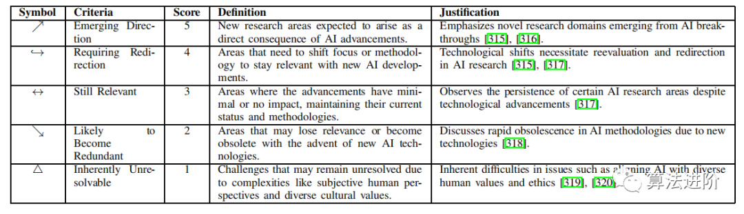 AGI预计将改变自学和探索,通过结合PPO等方法,实现自主学习和解决问题的水平,超越当前AI模型对训练数据的依赖,减少再训练需求,促进动态适应,对不断变化的场景响应。AGI集成多种架构,复制人类认知,通用适配器方法促进信息同化,使AGI成为跨领域执行任务的系统,具有人类智力的适应性。尽管AGI全部功能尚在推测,但先进医疗保健诊断的潜在应用已显现,人工智能驱动的预测医学模型突破证明了AGI改变医疗诊断和治疗的潜力。AGI预计将利用Transformer架构算法,理解人类语言和社会情感的微妙之处,实现复杂、有同理心、上下文感知的交互,潜在应用包括改变人工智能系统通信方式和相互作用。符号AI和概率推理的集成,使AGI系统掌握常识,缩小AI与自然智能的差距,增强AGI在现实世界的导航和响应能力,实现与人类思维过程的紧密结合。AGI在形式验证系统指导下,整合现实世界知识,具有准确、有道德的输出,能与现实世界复杂性进行负责任互动。预计AGI将应对气候变化等全球挑战,通过先进数据分析和预测建模,在环境监测、气候预测和制定可持续解决方案方面发挥关键作用,助力全球生态努力。AGI的发展既带来机遇,也面临挑战。虽然AGI有望提高创意生产力和创新跨模式生成技术,但数据偏差、计算效率和道德影响等挑战依然存在。在AGI开发中,需要采取平衡方法,重点关注数据管理、高效系统和社会影响。在AGI发展的背景下,专家警告不要高估当前AI能力,强调AGI理论与实际差距。AGI设想的自主性和认知能力使其区别于现有模型,未来AI系统可跨领域执行任务。道德和技术突破对AGI成为社会变革力量至关重要。预测实现通用AI的时间表仍不确定,但认识到障碍如计算能力限制和复制类人认知的复杂性至关重要。追求通用AI过程中需要持续研究和伦理考虑,确保负责任和认真的发展。随着 MoE、多模态和AGI等先进人工智能发展的出现,生成式人工智能研究的格局正在发生重大转变。本节分析这些发展如何重塑生成人工智能的研究分类。生成式AI的进步引发了研究领域的变革,为此我们建立了一套标准来评估其影响(如表2)。这套标准深深植根于技术进步与研究重点领域之间的动态相互作用。我们的分析框架是在从新兴到过时的梯度尺度上构建的,反映了生成AI研究领域正在重塑的程度。我们将其分为五个不同的类别,进行复杂的评估,同时承认并非所有领域都会受到一致的影响。这种多层次的方法是基于技术颠覆的历史模式和科学探究的适应性。本文讨论了人工智能发展对科学研究的影响,将研究领域分为五类:新兴方向、需要转变方向的领域、仍然相关、可能变得冗余和本质上无法解决。新兴方向基于人工智能发展历史,揭示新科学之谜和途径。需要转变方向的领域需吸收新兴AI范式,全面改革传统方法。仍然相关领域通过解决持久探究或固有适应性,抵御AI创新浪潮。可能变得冗余领域面临过时,需前瞻性战略和资源重新分配。本质上无法解决挑战提醒我们,AI追求受制于人类伦理和文化多样性的复杂网络。