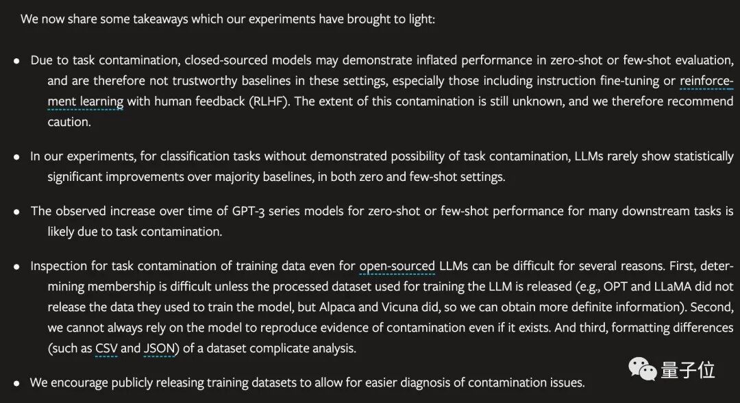 - 由于任务污染,闭源模型可能会在零样本或少样本评估中表现的比实际好,特别是经过RLHF微调的模型。污染的程度仍不清楚,因此我们建议谨慎行事。
