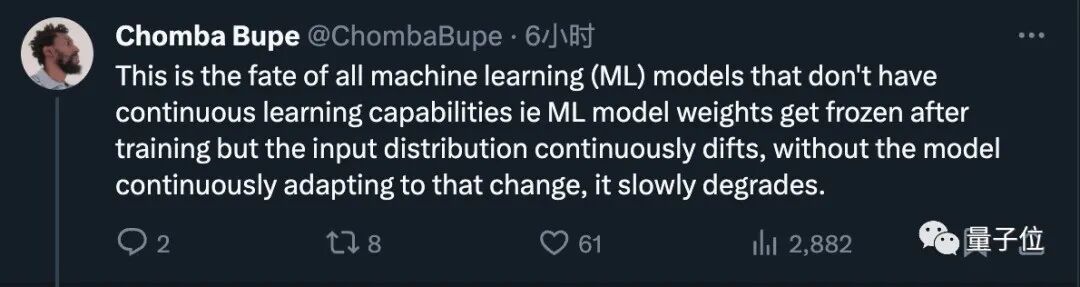 也有学者从另一个角度指出,大模型训练后参数冻结,人们不断提出新的任务也就是输入分布不断变化。如果模型不能不断适应这种变化,就表现成能力慢慢退化。