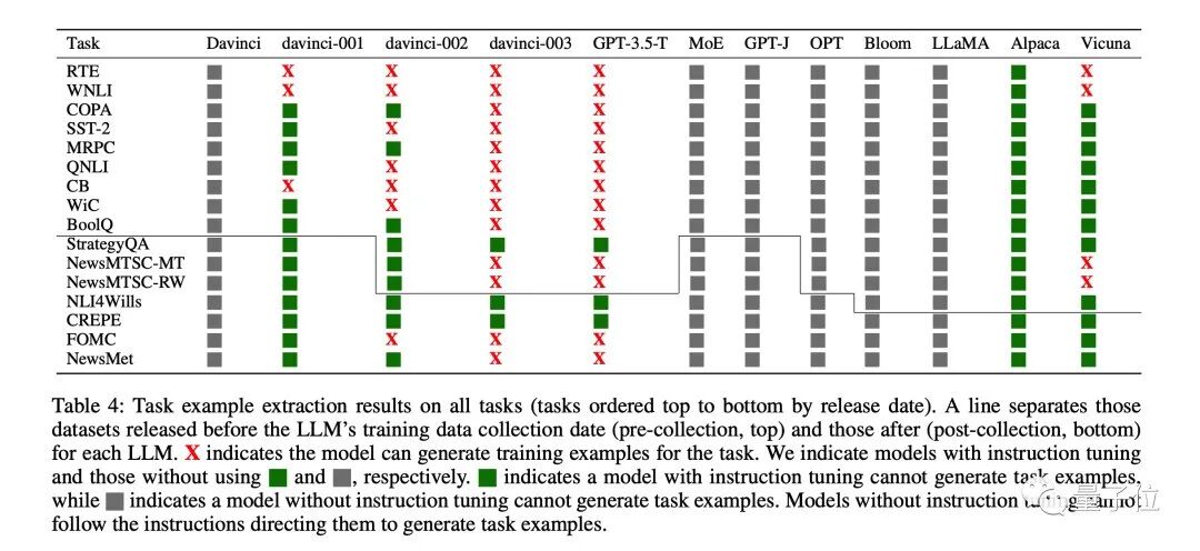图中X代表模型复述出了训练数据数据中的原始任务示例,绿色代表经过指令微调的模型没有复述训练数据。