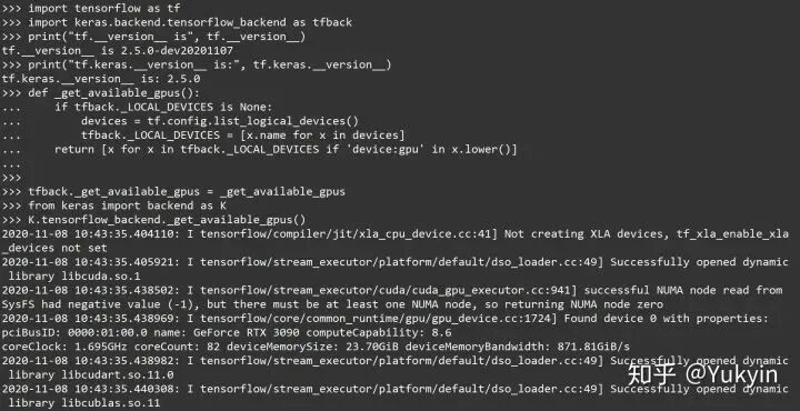 import tensorflow as tfimport keras.backend.tensorflow_backend as tfback print("tf.__version__ is" , tf.__version__) print("tf.keras.__version__ is:" , tf.keras.__version__) def _get_available_gpus () : if tfback._LOCAL_DEVICES is None : devices = tf.config.list_logical_devices() tfback._LOCAL_DEVICES = [x.name for x in devices] return [x for x in tfback._LOCAL_DEVICES if 'device:gpu' in x.lower()] tfback._get_available_gpus = _get_available_gpusfrom keras import backend as K K.tensorflow_backend._get_available_gpus()
