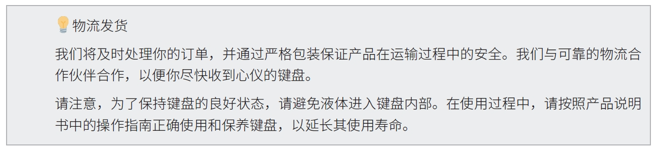对于第一个有 450 人浏览的产品,产品描述中有详细的产品介绍,并植入了与机械键盘相关的许多长尾关键词,比如 61 键、机械键盘、红轴、青轴、茶轴等。这些关键词都是搜索热度较高的关键词。此外,产品描述层次清晰,不仅有产品介绍,还有关于物流的发货地区,以及多久能够发货的详细说明,这会增加用户对产品的信任感。
