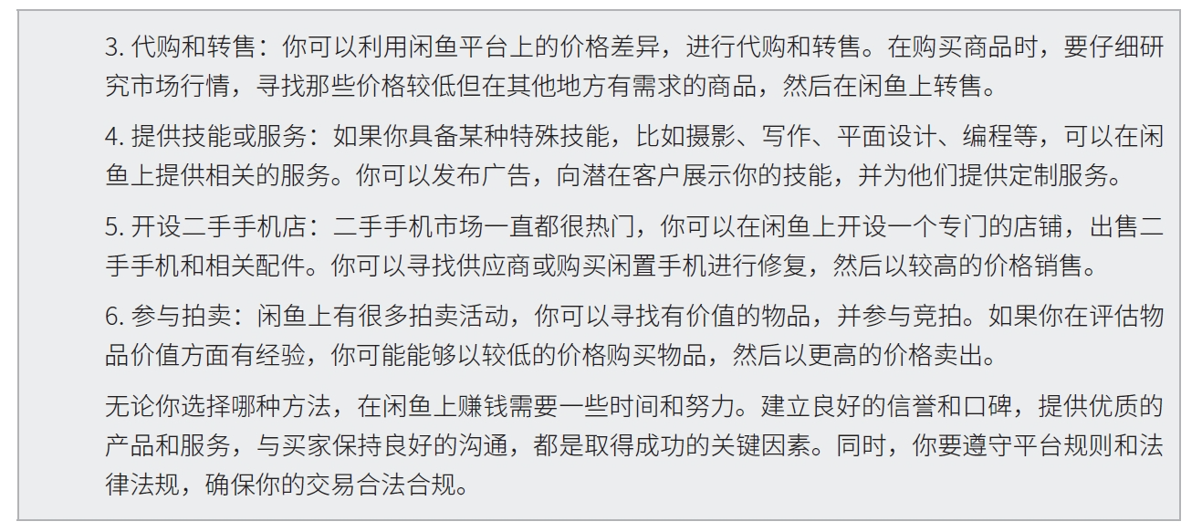 从前面的答案中,我们可以看出,ChatGPT 对闲鱼平台的规则比较熟悉,其列出的关键词研究、标题优化、商品描述等内容都非常重要。