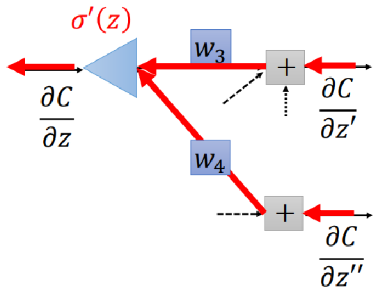 假设我们有一个如上图所示的神经网络,我们想求损失函数 对 的gradient,那么根据链式法则,我们有而我们可以很容易得到上述式子右边的第二项,因为 ,所以有我们很容易得到上式右边第二项,因为 ,而激活函数 (e.g., sigmoid function)是我们自己定义的,所以有 和 的值是已知的,因此,我们离目标 仅差 和 了。接下来我们采用动态规划(或者说递归)的思路,假设下一层的 和 是已知的,那么我们只需要最后一层的graident,就可以求得各层的gradient了。而通过softmax的例子,我们知道最后一层的gradient确实可求,因此只要从最后一层开始,逐层向前,即可求得各层gradient。因此我们求 的过程实际上对应下图所示的神经网络(原神经网络的反向神经网络):综上,我们先通过神经网络的正向计算,得到 以及 ,进而求得 和 ;然后通过神经网络的反向计算,得到 和 ,进而求得 ;然后根据链式法则求得 。这整个过程就叫做backpropagation,其中正向计算的过程叫做forward pass,反向计算的过程叫做backward pass。具体来说,如下图所示,没有连线的表示对应的w为0: