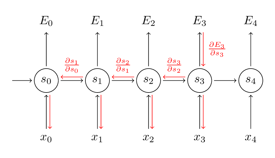 ,那这样就跟普通的全连接层一样了,因此也就可以用backpropagation来求。RNN按照时序展开之后如下图所示(红线表示了求gradient的路线):