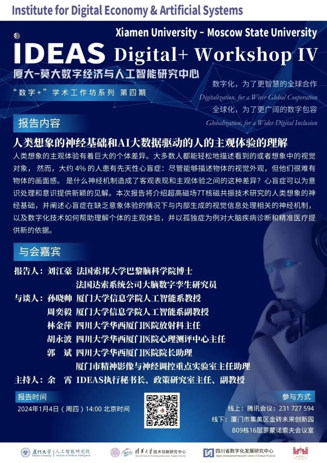 人类想象的主观体验有着巨大的个体差异。大多数人都能轻松地描述看到的或者想象中的视觉对象, 然而,大约 4% 的人患有先天性心盲症:尽管能够描述物体的视觉外观,但他们很难有物体的画面感。是什么神经机制造成了客观表现和主观体验之间的这种差异?心盲症可以为意识处理和意识提供新颖的见解。本次报告将介绍超高磁场7T核磁共振技术研究的人类想象的神经基础,并阐述心盲症在缺乏意象体验的情况下与内部生成的视觉信息处理相关的神经机制,以及数字化技术如何帮助理解个体的主观体验,并以孤独症为例对大脑疾病诊断和精准医疗提供新的依据。