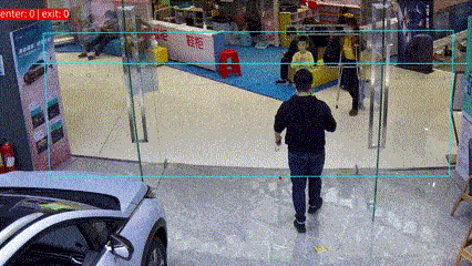 图 1客流统计任务示意。出处: https://www.bilibili.com/video/BV1xe4y197pv/ 本赛题旨在对目标区域内行人跨越标志线的行为进行统计。需要统计的信息包括进出区域的人数,以及他们的年龄和性别。该项任务可以应用在各种人流量较多的场所,如车站、商场、剧院等。通过对客流数据的分析,可以为商业分析、城市决策提供数据支撑。