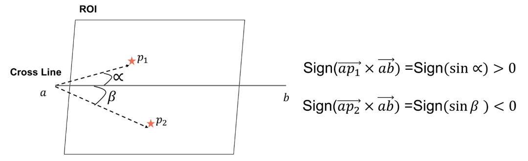 之前有的方案通过计算直线方程判断线段是否相交来判断行人是否跨越了标志线。这种方法计算方式繁琐,并且需要计算斜率可能会导致斜率消失和爆炸问题。因此在这里我们使用向量叉乘去判断行人轨迹和标志线是否交叉。具体来说,如下图所示,通过计算向量 和