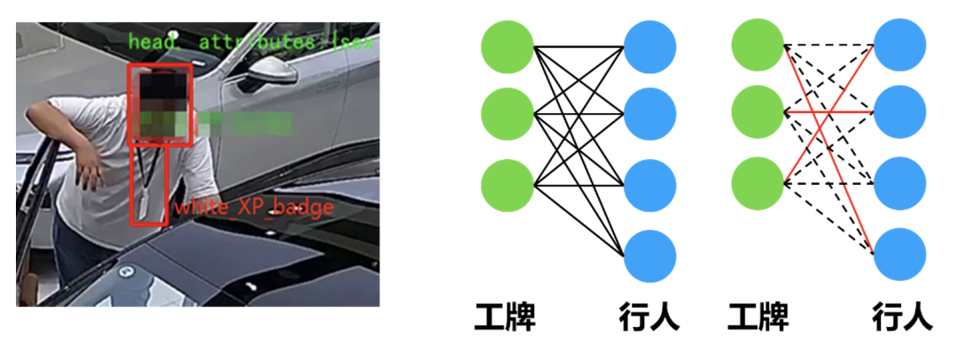 工牌绑定 图 10工牌绑定示意图 由于业务需要我们将佩戴工牌的行人剔除统计结果,且检测结果中的工牌和行人是独立的,这里我们需要对行人和工牌进行绑定。我们使用检测框坐标的中心点位置作为匹配对象,采用经典的匈牙利算法对行人和工牌配对。