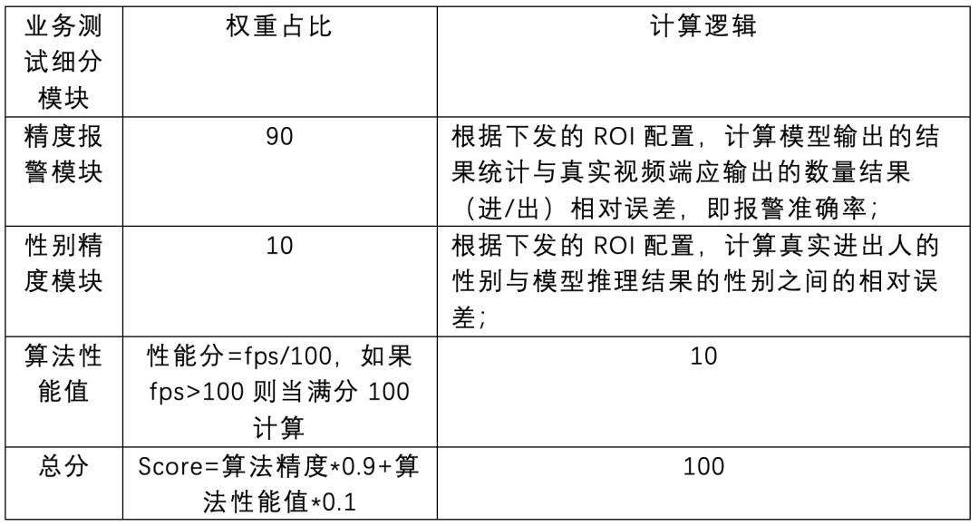 业务逻辑 业务逻辑要求我们对行人进出商场进行统计,给算法的输入就包括有视频、标志线、参考点、ROI。具体的评分计算方式如下表所示: