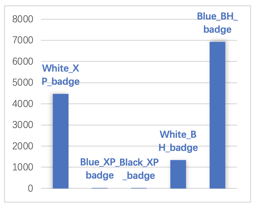 图3 检测框尺寸统计 图4 工牌统计 在观察到工牌类型虽然分为了5类,但数量极不均衡。因此,我们将细分的工牌类别归为1类,使得训练更稳定。